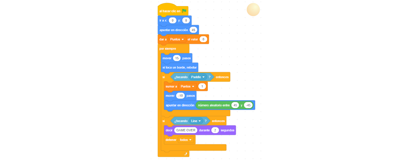 Cuando la bola rebote contra la pala, aumentará un punto la puntuación (Previamente hay que crear una variable llamada "Puntos").