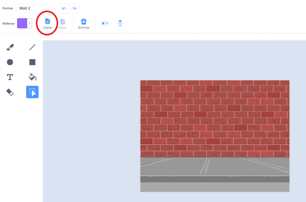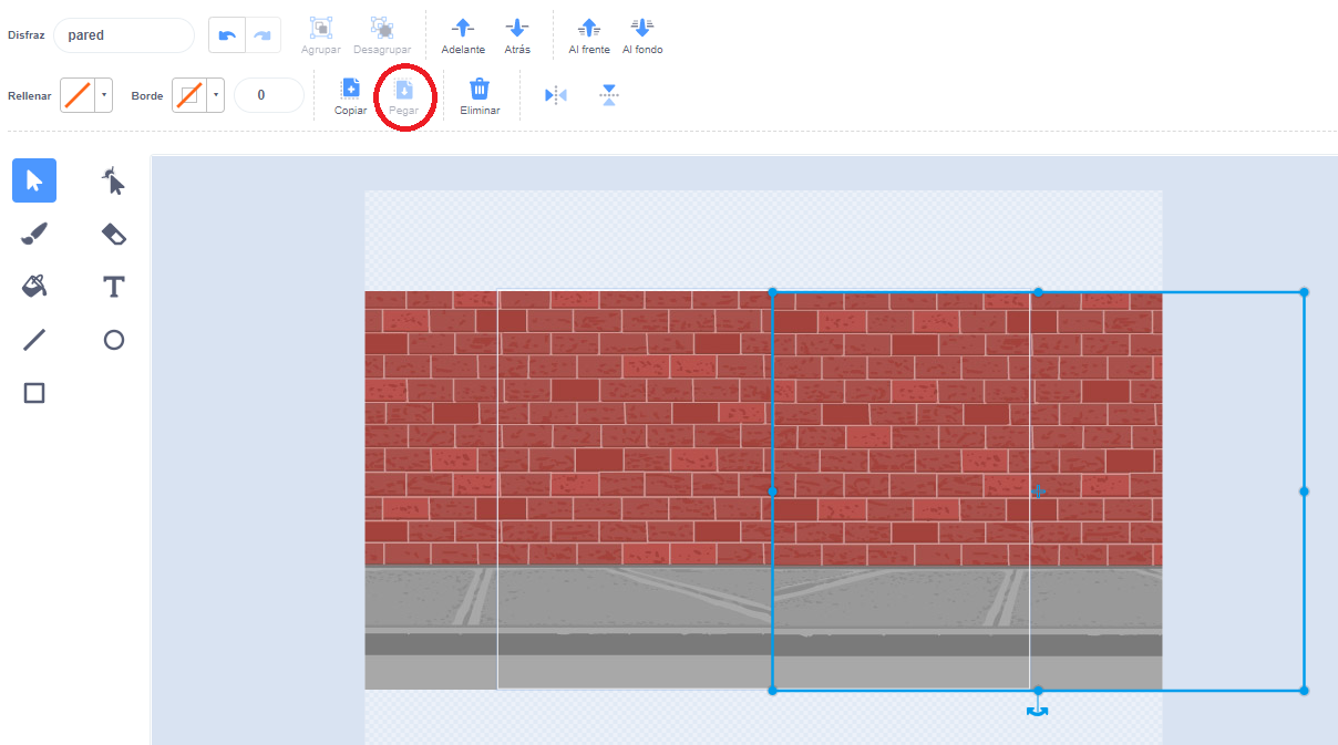 Luego creamos un nuevo objeto eligiendo la opción "Pinta" del menú de objetos y pegamos dos veces el fondo pegado en el editor de disfraces mediante el icono "Pegar".