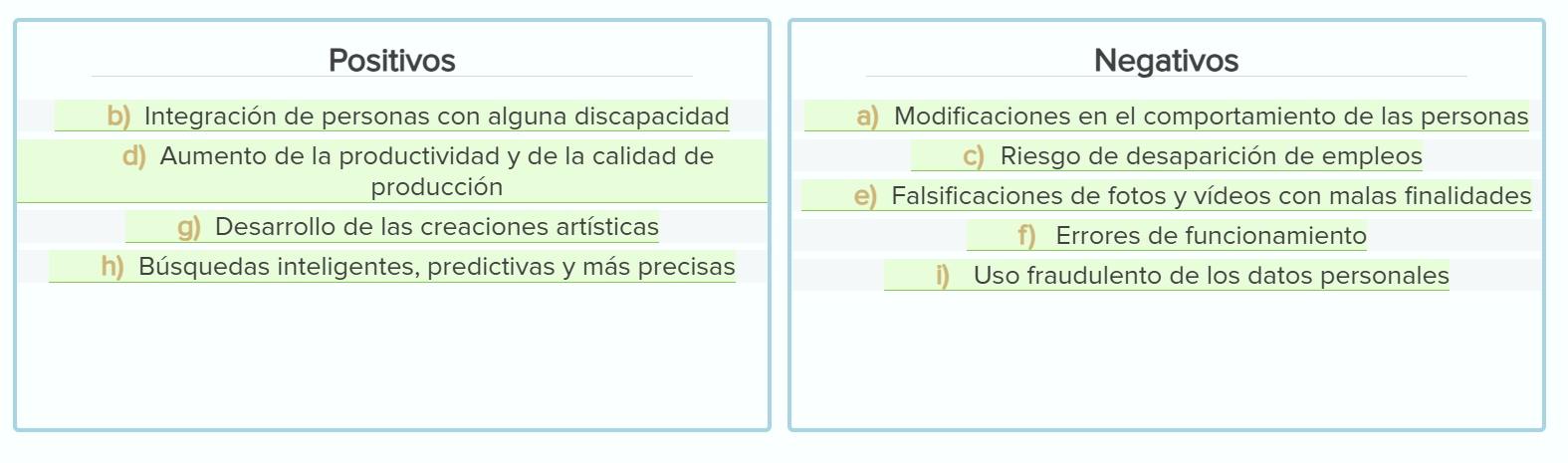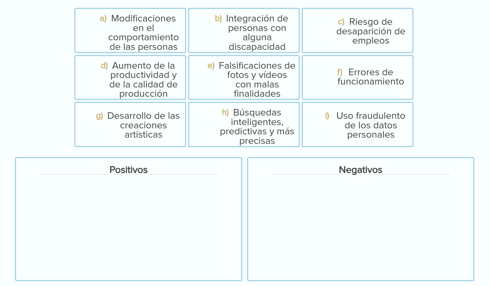 Indica si son positivos o negativos los siguientes ejemplos de impactos de la inteligencia artificial: