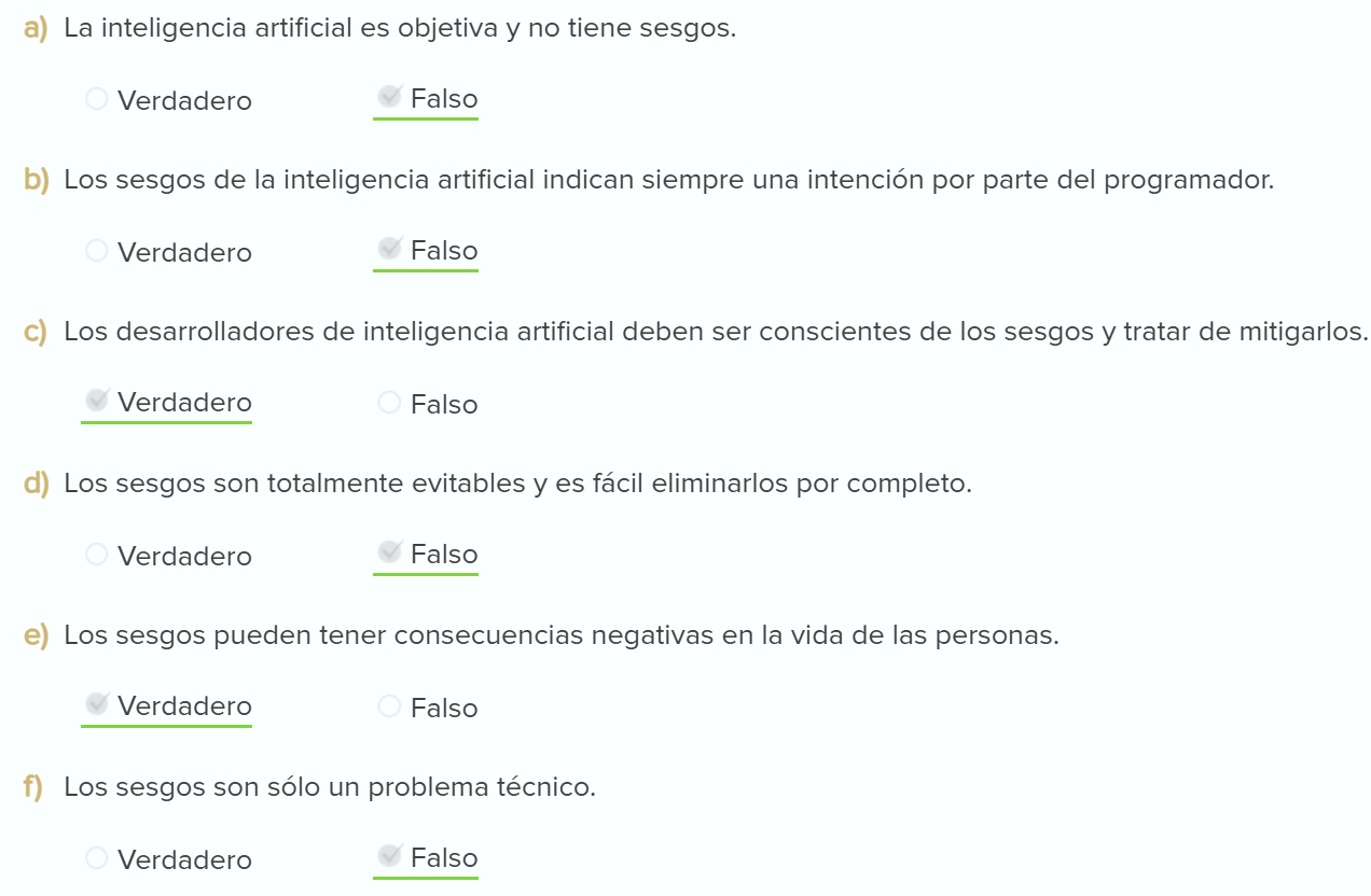 Indica si las siguientes afirmaciones sobre los sesgos son verdaderas o falsas: