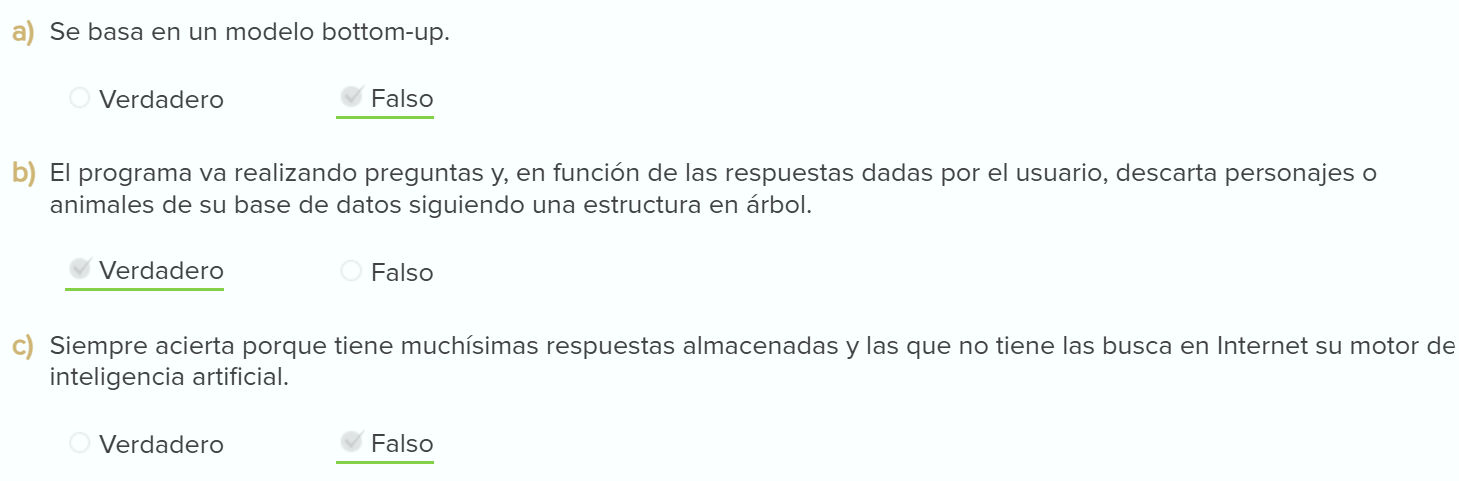 - El programa va realizando preguntas y, en función de las respuestas dadas por el usuario, descarta personajes o animales de su base de datos siguiendo una estructura en árbol.