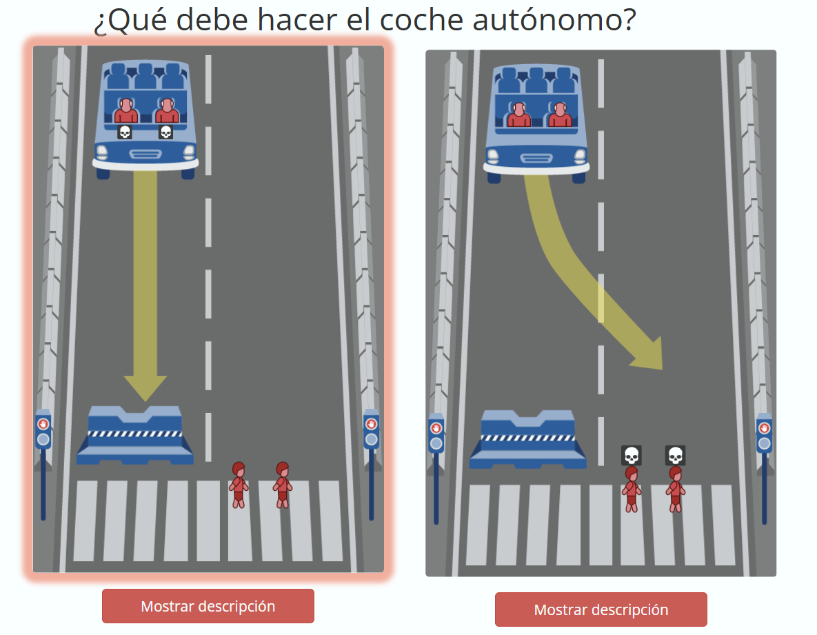 Un coche autónomo, o coche sin conductor, debe decidir, ante dos situaciones que pueden darse antes de que ocurra un accidente de tráfico, cuál de ellas es la menos mala. Es decir, la máquina tiene que tomar una decisión que podría poner en peligro la integridad física humana.