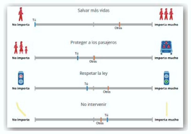 El usuario puede juzgar cuál es el resultado que considera más aceptable moralmente. Al final, sus respuestas se comparan con las de otras personas.