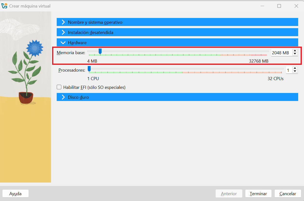 Configura los elementos mínimo para la creación de una máquina virtual: