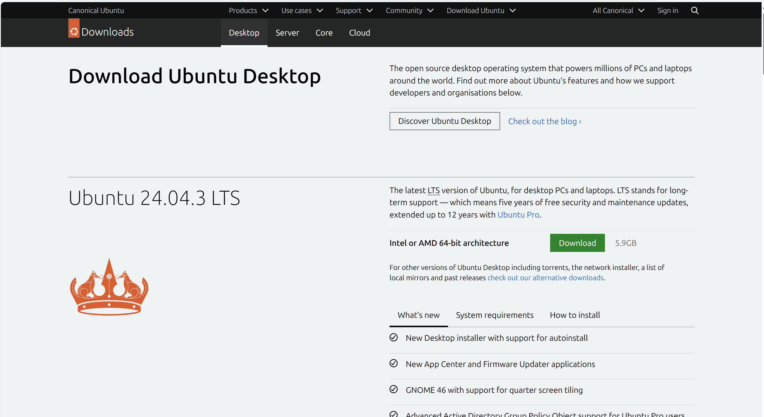 Vamos a realizar el ejemplo de creación de una máquina virtual corriendo la distribución ubuntu. El primer paso sería acudir a la web de ubuntu y descargar el fichero ISO de la última versión Ubuntu LTS de escritorio. En la web ubuntu podemos encontrar una opción de Download, a partir de la cual nos descarga la ISO correspondiente. La imagen .iso es bastante grande, por lo que tardará un poco en descargarse en conexiones más lentas.