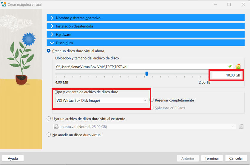 Por último, debemos indicar que deseamos crear un nuevo disco duro para esta máquina. Seleccionamos formato VDI, tamaño fijo y un espacio, por ejemplo de 10Gb.