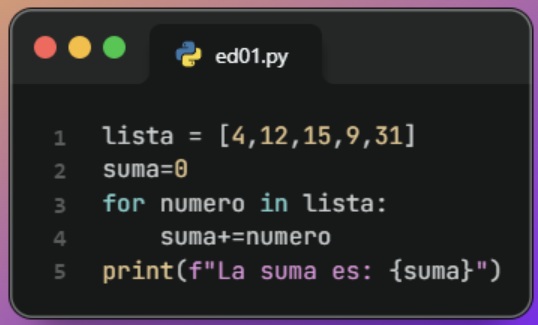# Definir una lista de números numeros = [3, 5, 7, 9, 11] # Inicializar la suma suma_total = 0 # Recorrer la lista y sumar los elementos for numero in numeros: suma_total += numero # Mostrar el resultado print(f"La suma de todos los números es: {suma_total}")Primero definimos una lista de números. Luego inicializamos la variable suma_total en cero. Usamos un bucle for para recorrer la lista y sumar cada elemento. Finalmente, mostramos el resultado con print().