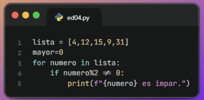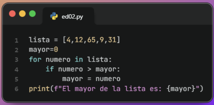 # Definir una lista de números numeros = [23, 56, 12, 89, 4] # Inicializar el número mayor mayor = numeros[0] # Recorrer la lista for numero in numeros: if numero > mayor: mayor = numero # Mostrar el número mayor print(f"El número mayor es: {mayor}")Asignamos el primer elemento como valor inicial del mayor y lo comparamos con el resto usando un bucle for.