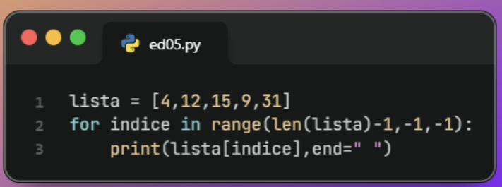 # Definir una lista de números numeros = [1, 2, 3, 4, 5] # Invertir la lista numeros_invertidos = numeros[::-1] # Mostrar la lista invertida print(f"Lista invertida: {numeros_invertidos}")Usamos
