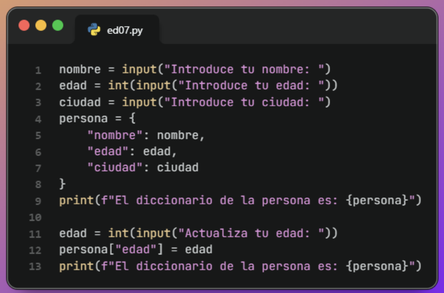 Amplía el ejercicio anterior para que se le pida al usuario una nueva edad, modifique la edad que tenía la persona y muestre nuevamente el diccionario actualizado.