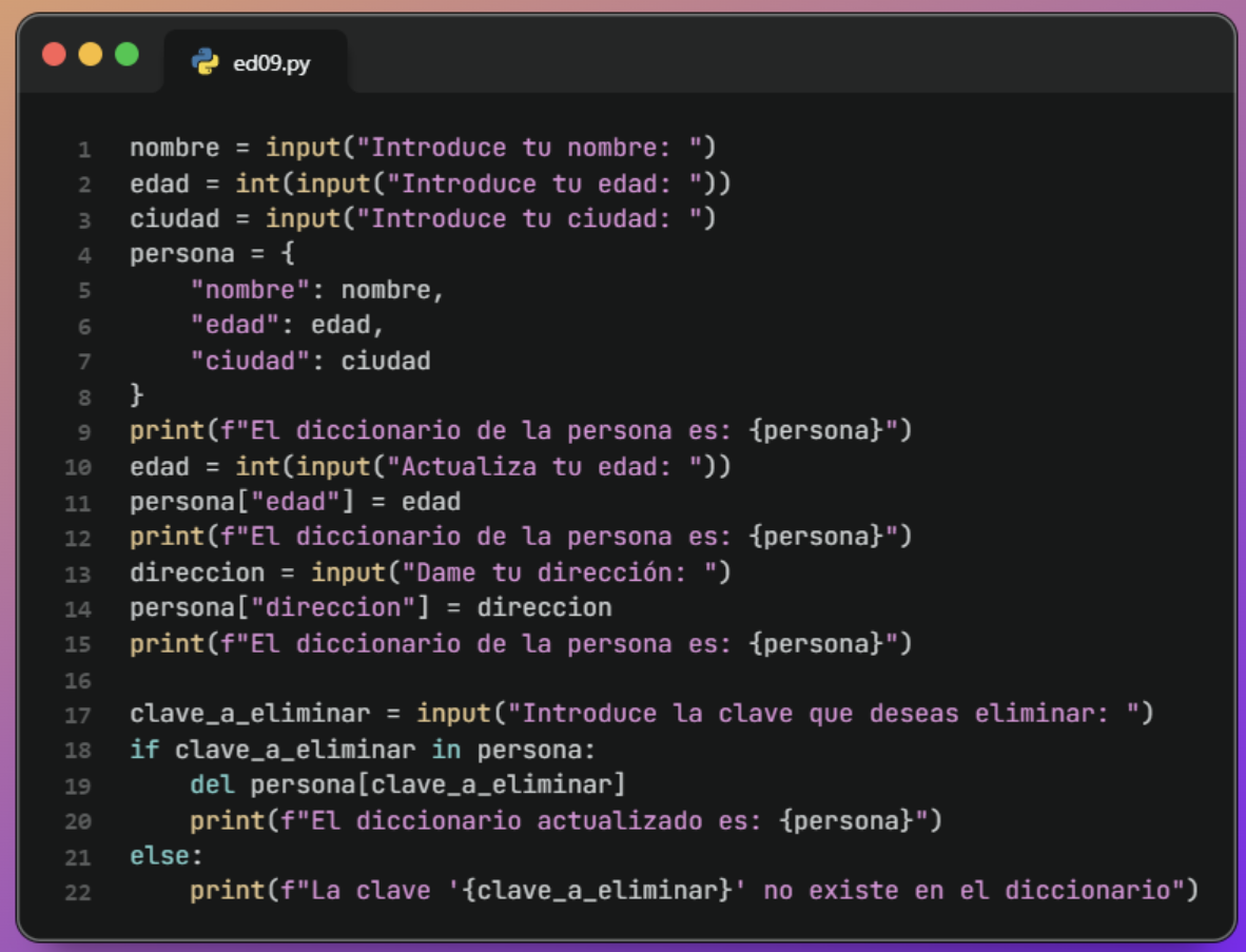 Amplía el ejercicio anterior para que se le pida al usuario una clave y elimine ese par clave-valor del diccionario persona. Muestra el diccionario actualizado.