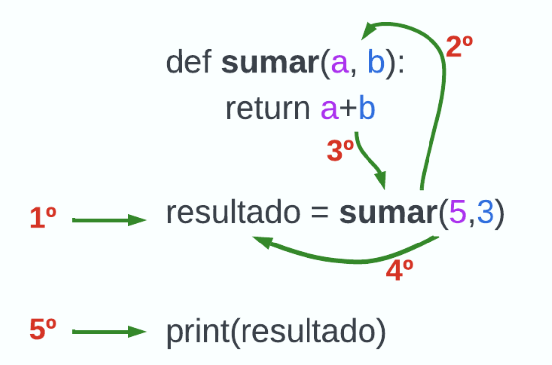 - Se busca la definición de la función sumar, se encuentra en la línea 1, y se sustituyen los parámetros por los valores, es decir, a=5 y b=3.