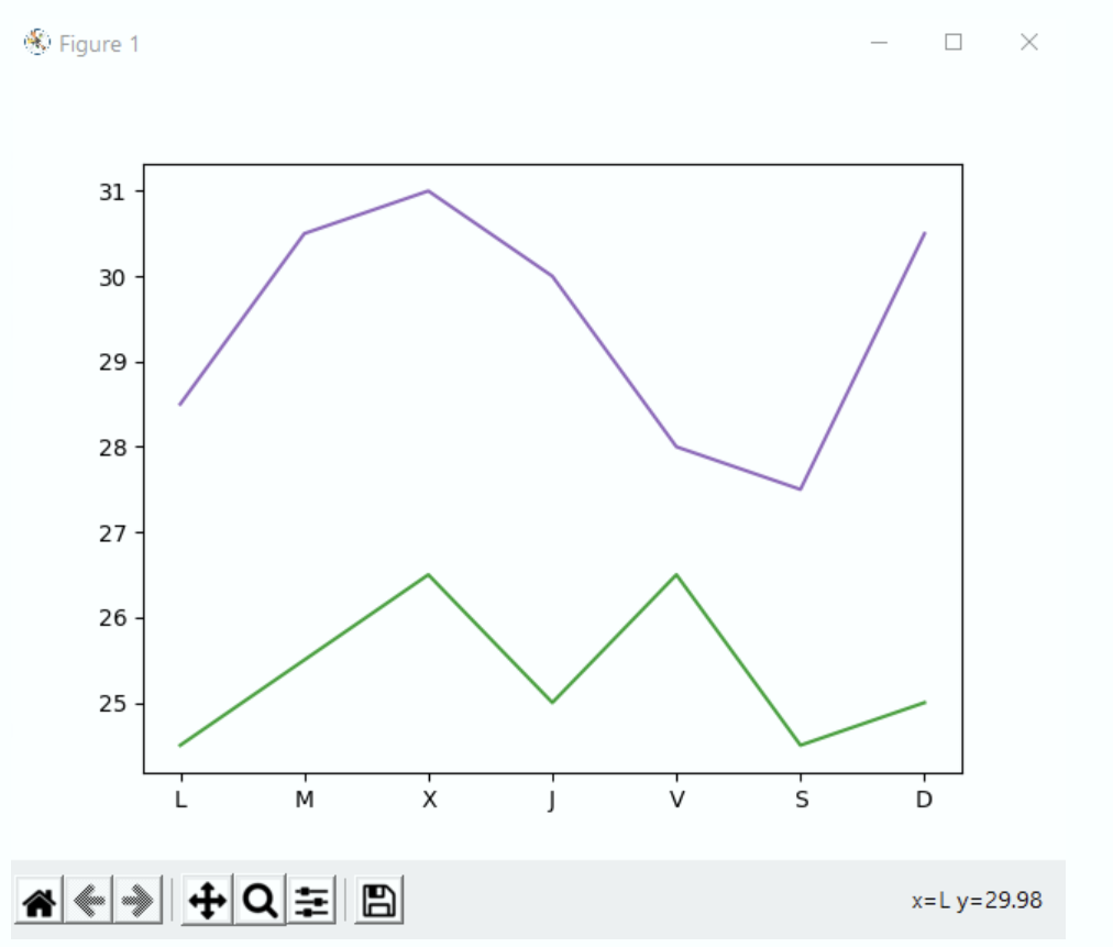 Otro ejemplo muy interesante podría ser el de visualizar gráficamente datos que tengamos recogidos por sensores. Un módulo muy popular que nos permite hacer esto es matplotlib. Vamos a usarlo para graficar las temperaturas de la última semana en Madrid y Barcelona: