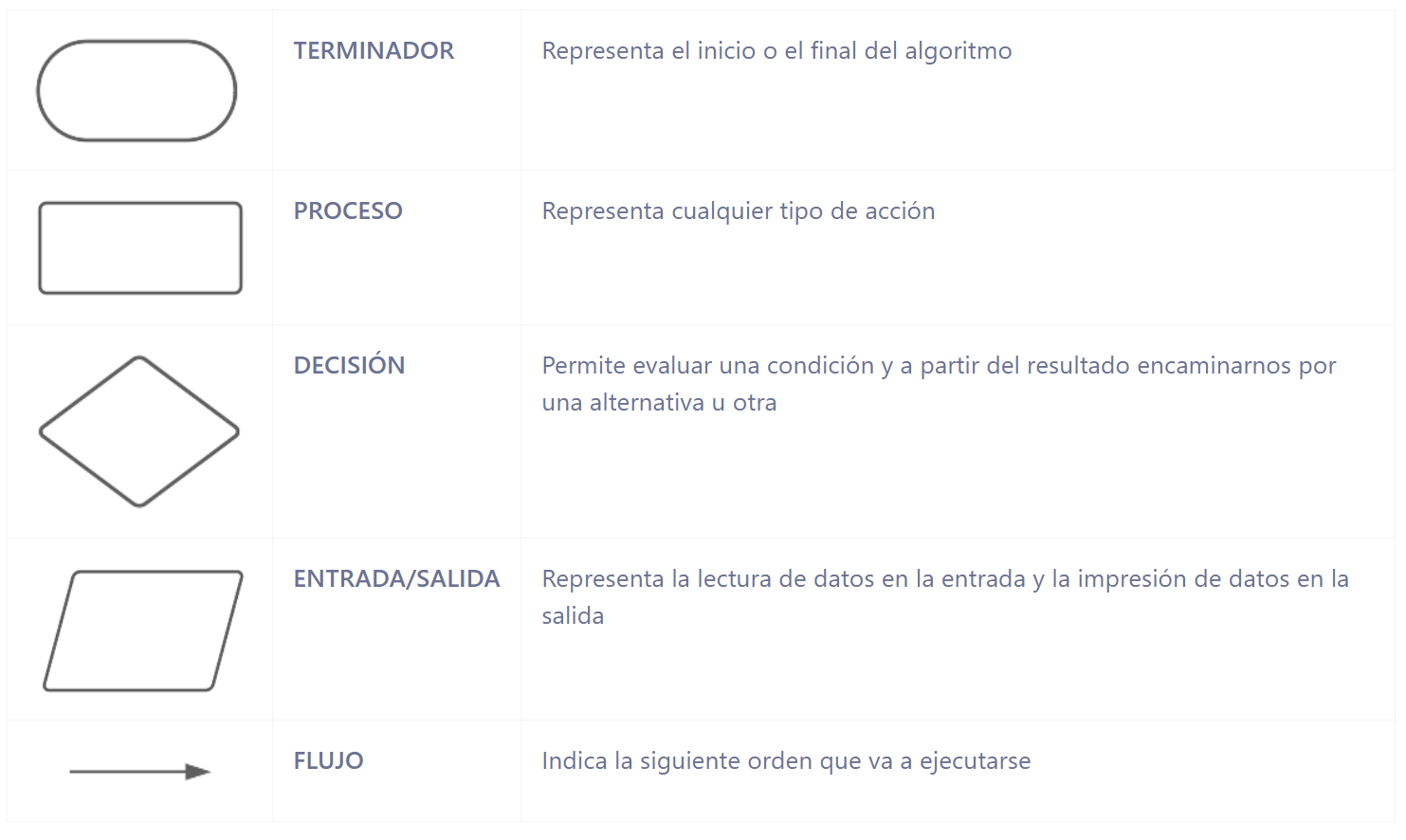 - Los paralelogramos marcan los puntos donde el usuario debe introducir información (que necesita el programa para continuar) o donde el programa muestra un resultado al usuario.
