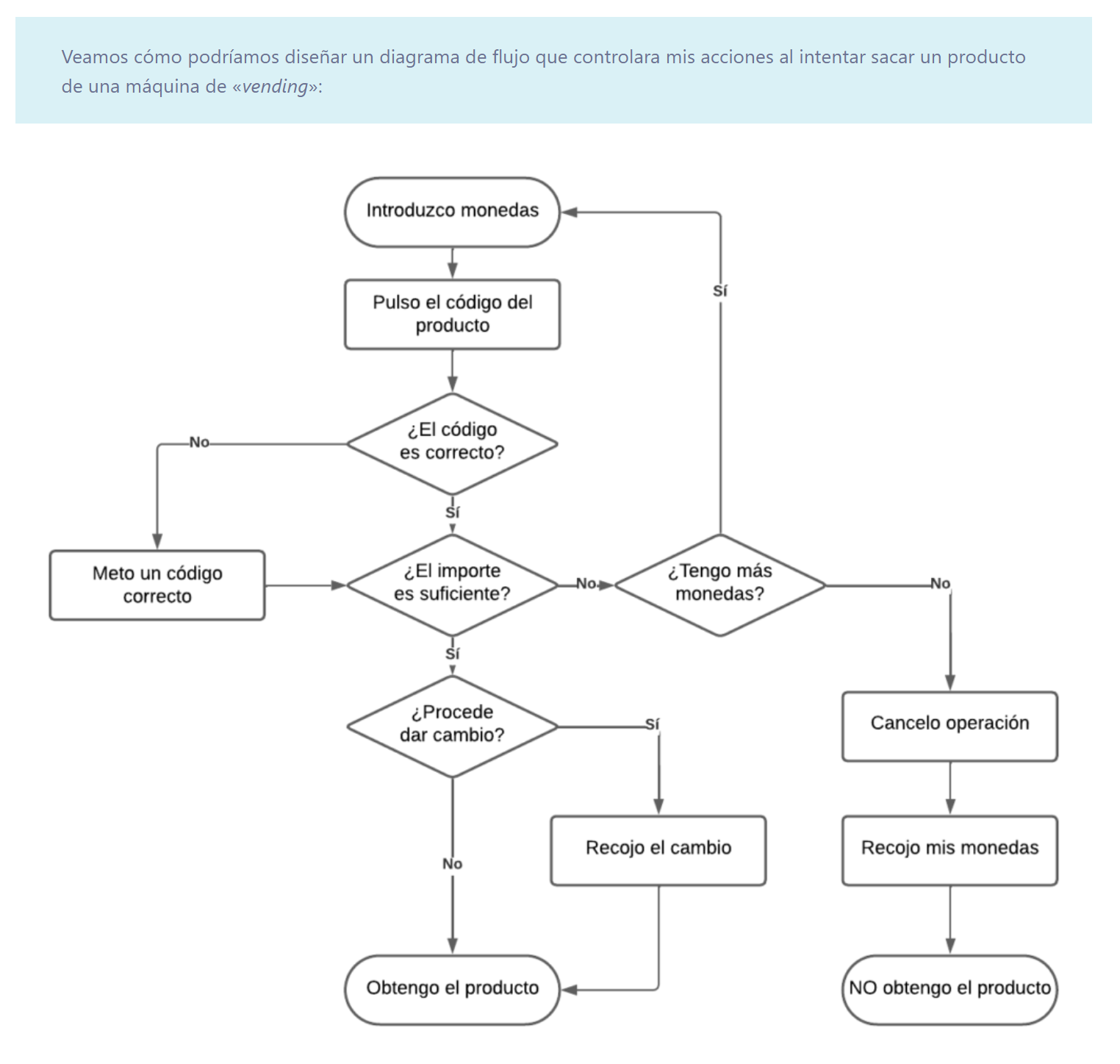 - Cuando el proceso requiere una decisión o condición, usamos un rombo. La flecha que sale de uno de los lados indica lo que ocurre si la condición es verdadera (sí), y la otra lo que ocurre si es falsa (no).