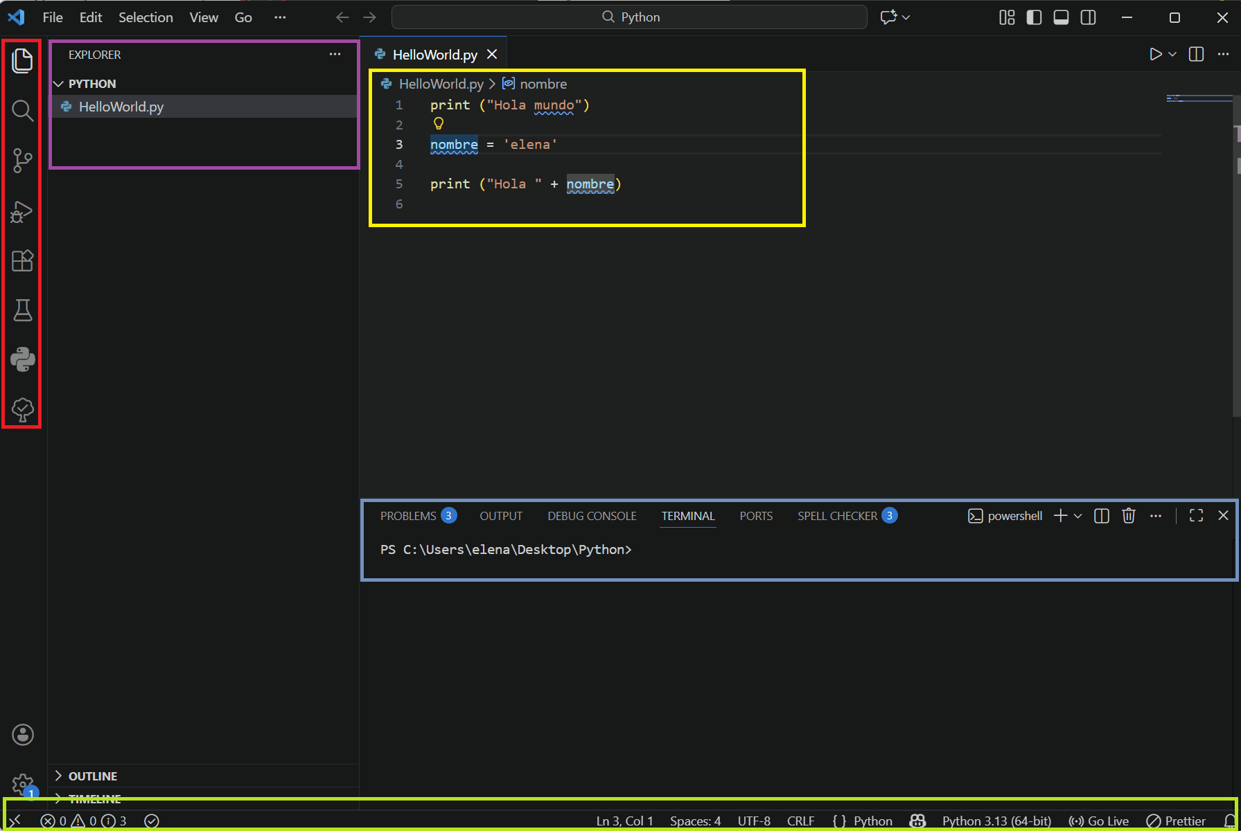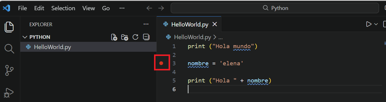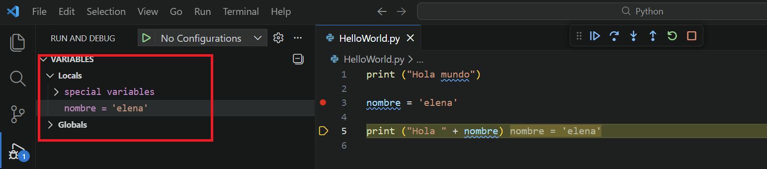 print ("Hola mundo") nombre = 'Elena' print ("Hola " + nombre) - Crea un break point en la variable nombre.