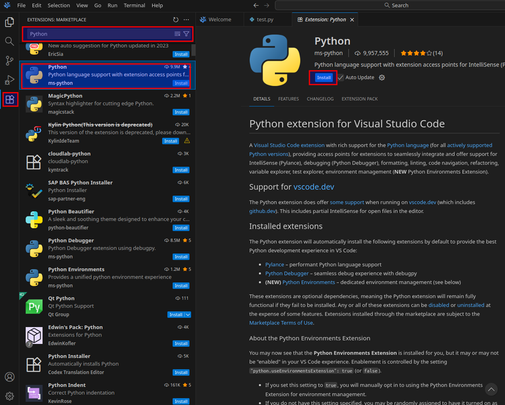 Para poder trabajar con Python, debemos instalar la extensión de Python.