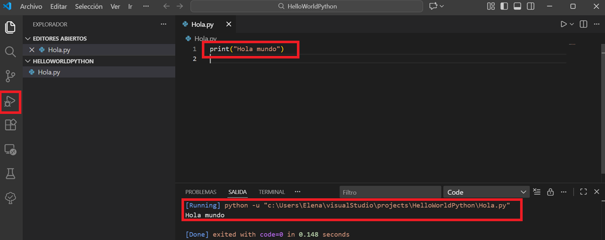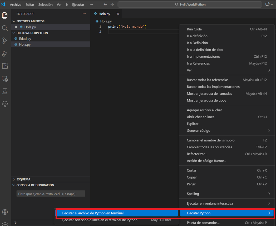 Escribimos un código sencillo print("Hola mundo"). Guardamos el fichero y ejecutamos el código con el botón derecho sobre el código Ejecutar Python.