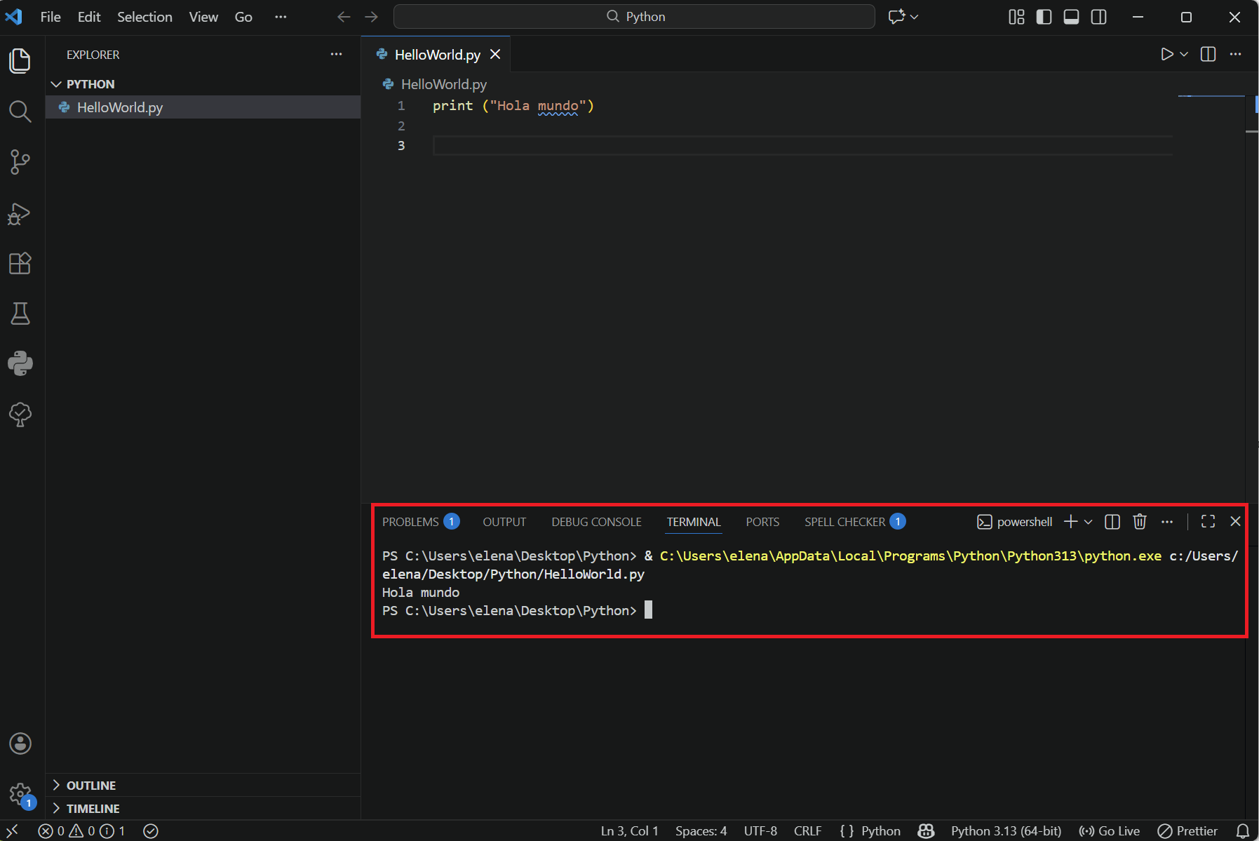print("Hola mundo") - Ejecútalo mediante el primer método explicado en los apuntes.