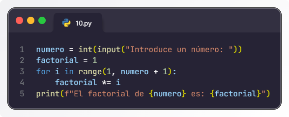 Usamos un bucle# Solicitar un número entero numero = int(input("Introduce un número entero: ")) # Inicializar el resultado del factorial factorial = 1 # Usar un bucle while para calcular el factorial while numero > 0: factorial = factorial * numero numero = numero - 1 # Mostrar el resultado print("El factorial es:", factorial)whilepara multiplicar el número por los valores decrecientes hasta que llega a 1. El resultado se almacena en la variable factorial. -
