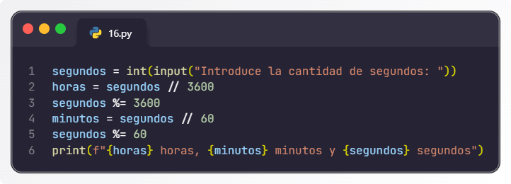Escribe un programa que pida una cantidad de segundos y la convierta a horas, minutos y segundos.