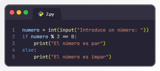 # Solicitar un número al usuario numero = int(input("Introduce un número entero: ")) # Verificar si el número es par o impar if numero % 2 == 0: print("El número es par.") else: print("El número es impar.") -