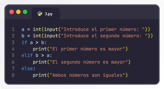```python # Solicitar tres números al usuario numero1 = float(input("Introduce el primer número: ")) numero2 = float(input("Introduce el segundo número: ")) numero3 = float(input("Introduce el tercer número: ")) # Determinar cuál es el mayor if numero1 >= numero2 and numero1 >= numero3: mayor = numero1 elif numero2 >= numero1 and numero2 >= numero3: mayor = numero2 else: mayor = numero3 # Mostrar el mayor número print(f"El número mayor es: {mayor}") ``` Usamos condiciones compuestas con operadores and para comparar los tres números y determinar cuál es el mayor. -
