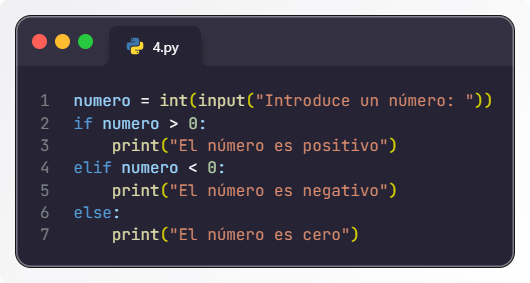 # Solicitar un número al usuario numero = float(input("Introduce un número: ")) # Condición para evaluar si es positivo, negativo o cero if numero > 0: print("El número es positivo.") elif numero < 0: print("El número es negativo.") else: print("El número es cero.") -
