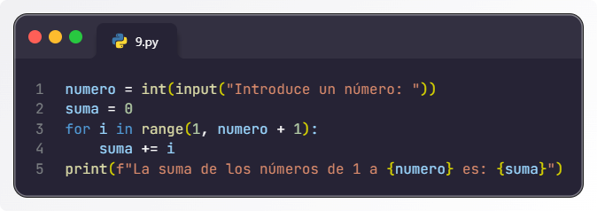 # Solicitar un número entero al usuario numero = input("Introduce un número entero: ") # Inicializar la suma suma = 0 # Recorrer los dígitos y sumarlos for digito in numero: suma += int(digito) # Mostrar la suma de los dígitos print(f"La suma de los dígitos es: {suma}")Convertimos el número en una cadena para poder recorrer sus dígitos con un bucle