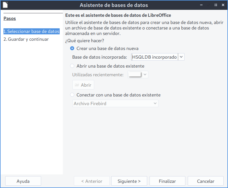 Para crear una base de datos nos situamos en el entorno de LibreOffice Base. En la ventana inicial, seleccionamos “Crear una nueva base de datos” y hacemos clic en Siguiente.