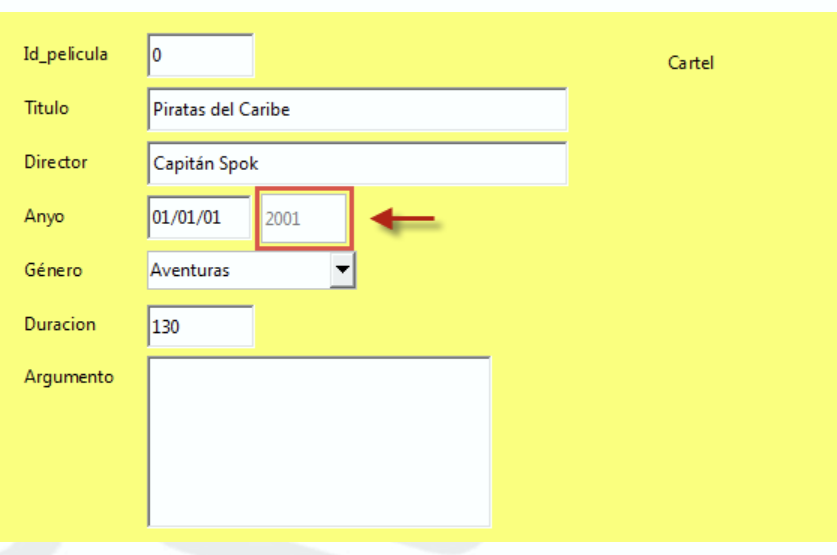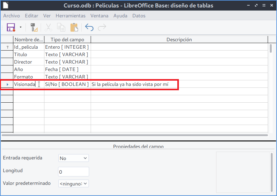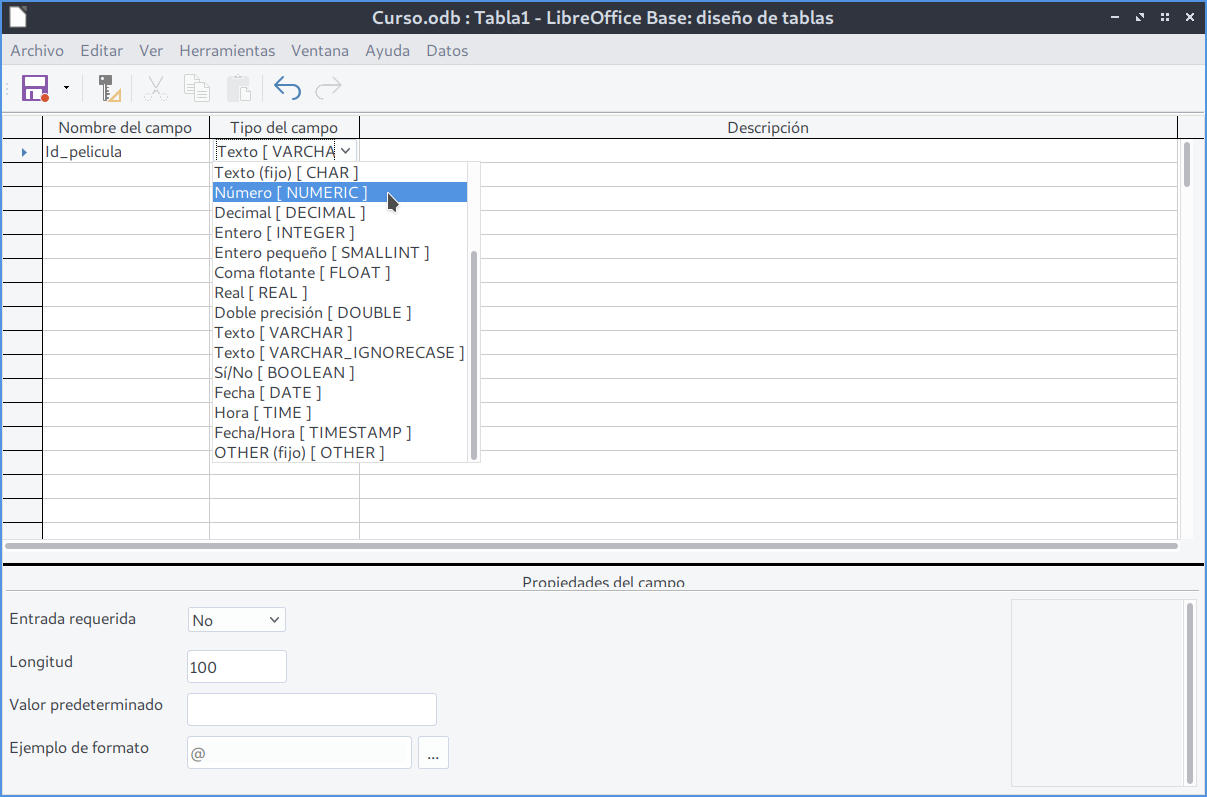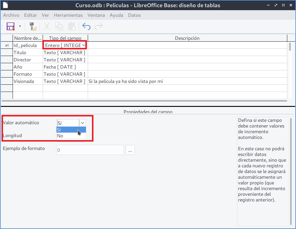 En el caso de cambio de tipo de datos, basta con seleccionar un nuevo tipo de dato del desplegable. Por ejemplo, si cambiamos es el tipo de dato de Id_pelicula de Número a Integer y fijamos esta columna con la propiedad Valor Automático a Sí , conseguiremos que nuestra clave principal tome valores automáticamente.