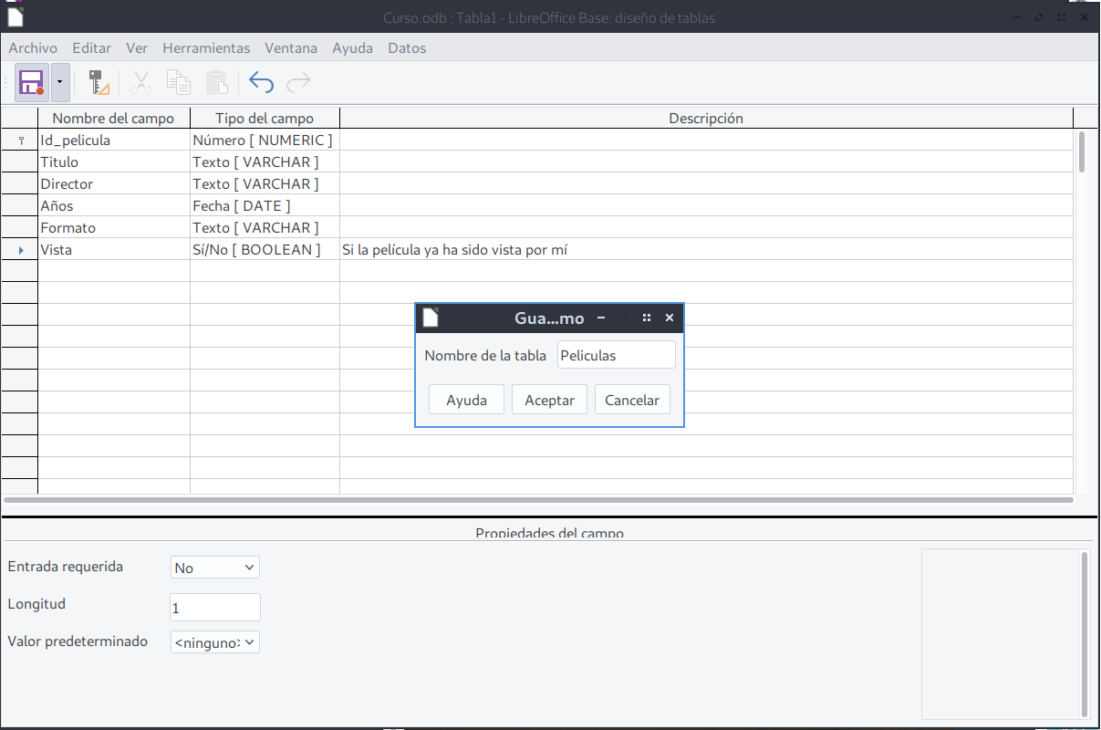 Por último, escribimos un nombre para el archivo (por ejemplo, peliculas.odb) y lo guardamos.