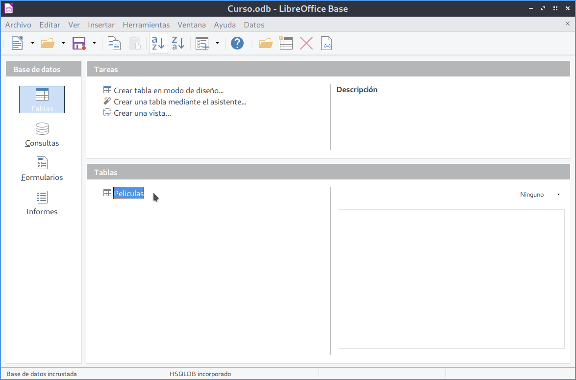 Si hemos seguido todos los pasos correctamente, nuestra tabla Peliculas debe aparecer dentro del apartado Tablas en la parte inferior de la ventana principal de LibreOffice Base.
