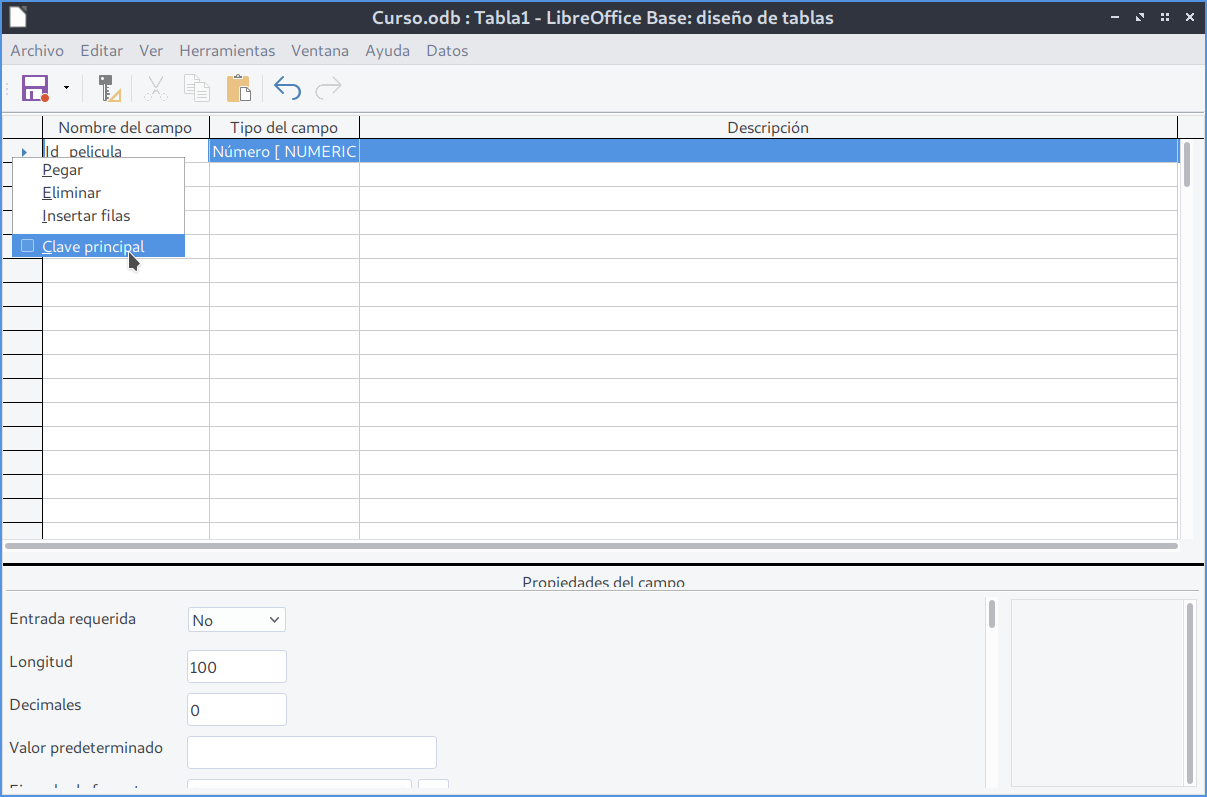 Toda tabla debe tener una Clave primaria (PK). Para marcar el campo Id_pelicula como clave principal, haz clic en el borde izquierdo de esa fila y selecciona el icono de llave 🔑. Esto indica que ese campo no puede repetirse ni quedar vacío.