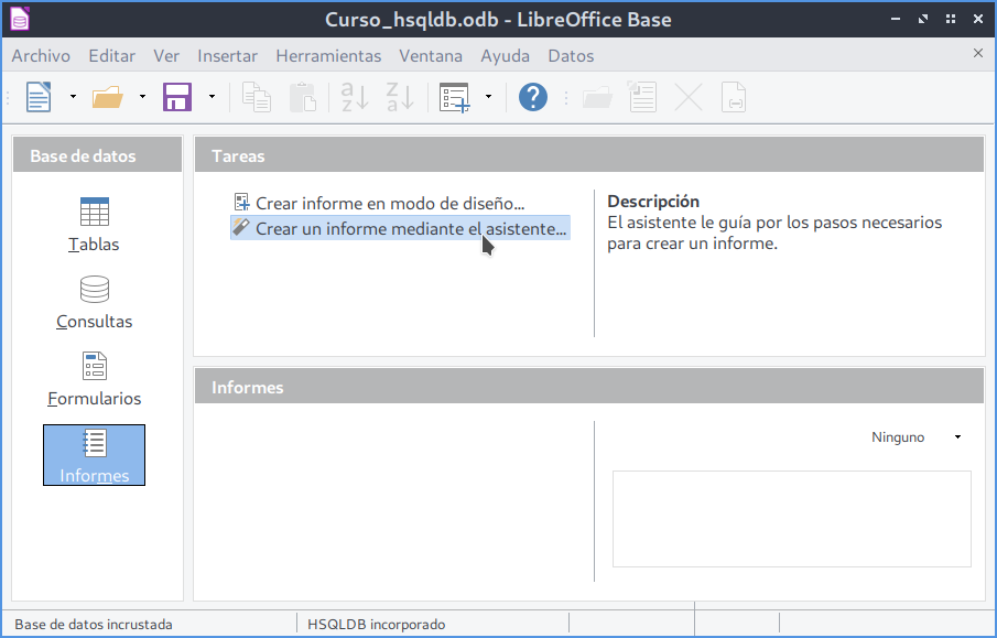 Para crear un informe vamos al panel Tareas de la sección Informes y seleccionamos: