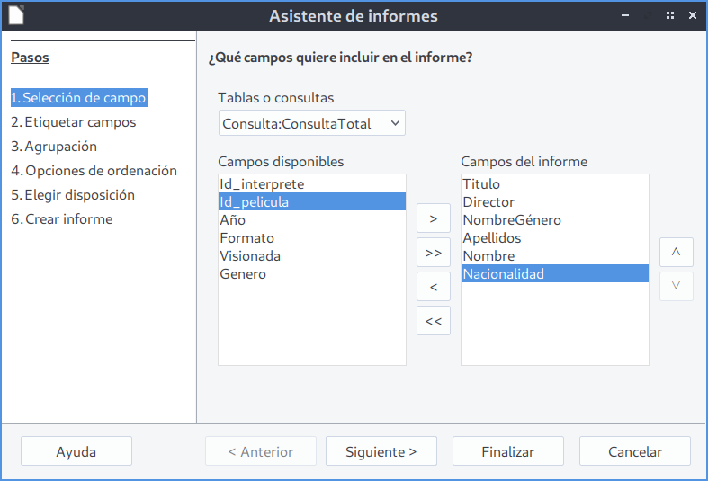 Selección de campos del informe -