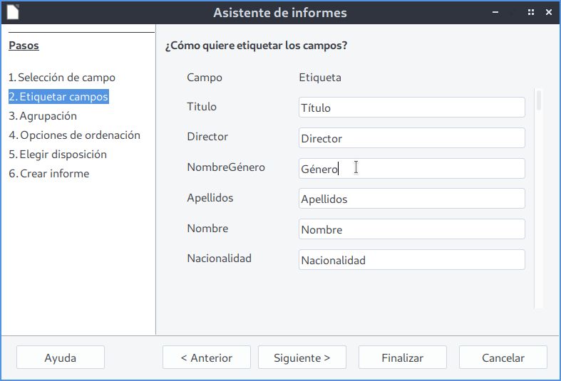 Etiquetas de los campos -