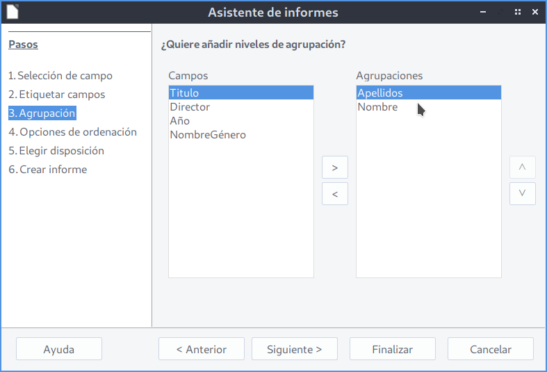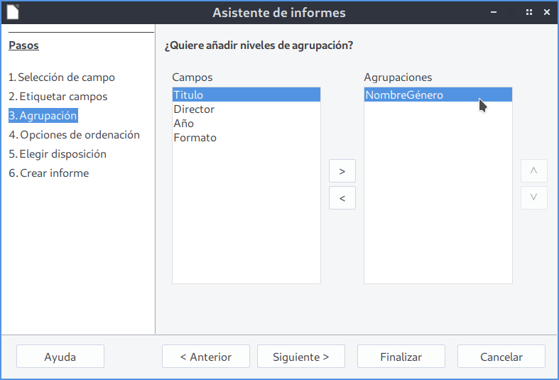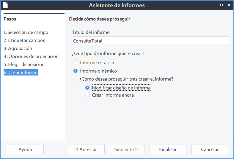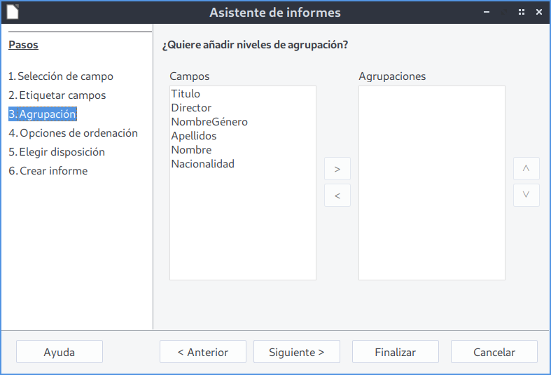 En este primer informe no se aplicará ninguna agrupación, por lo que dejamos todos los campos sin agrupar.