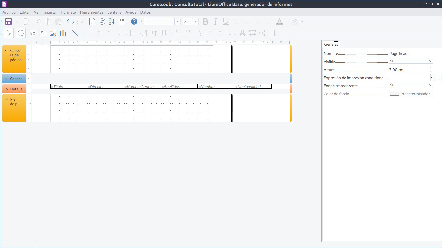 El modo Diseño muestra cuatro áreas principales: Cabecera de página, Cabecera, Detalle y Pie de página