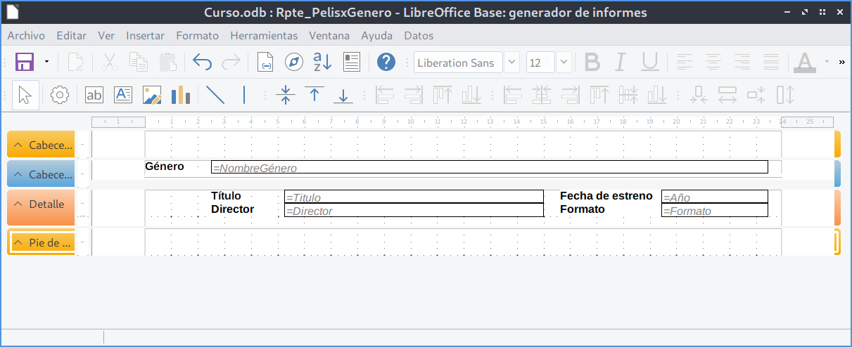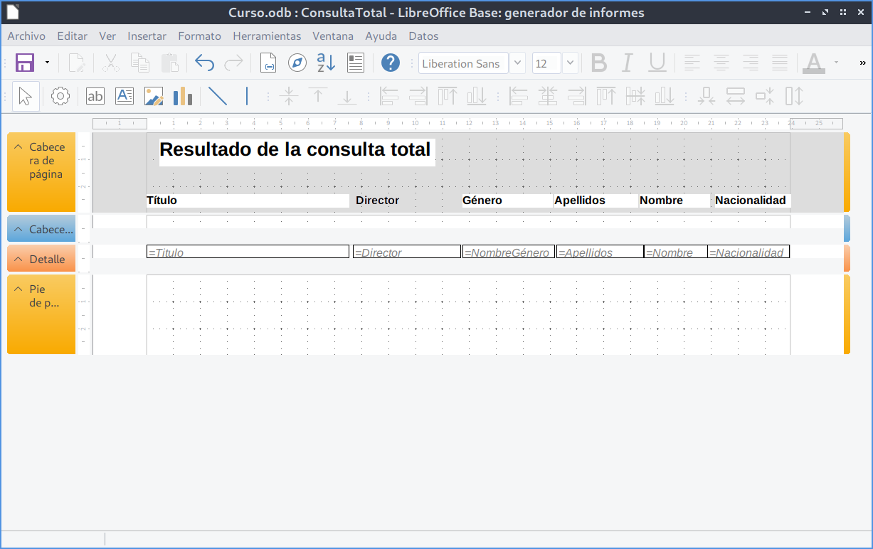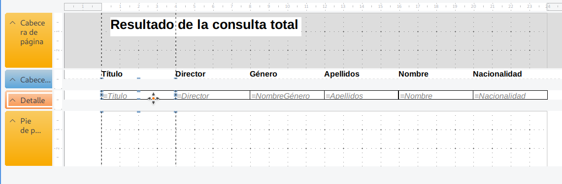 =, lo que indica que se mostrará un valor distinto por cada registro de la consulta.En estas áreas podemos: redimensionar los campos, recolocarlos para evitar que el texto aparezca cortado, añadir títulos o elementos decorativos