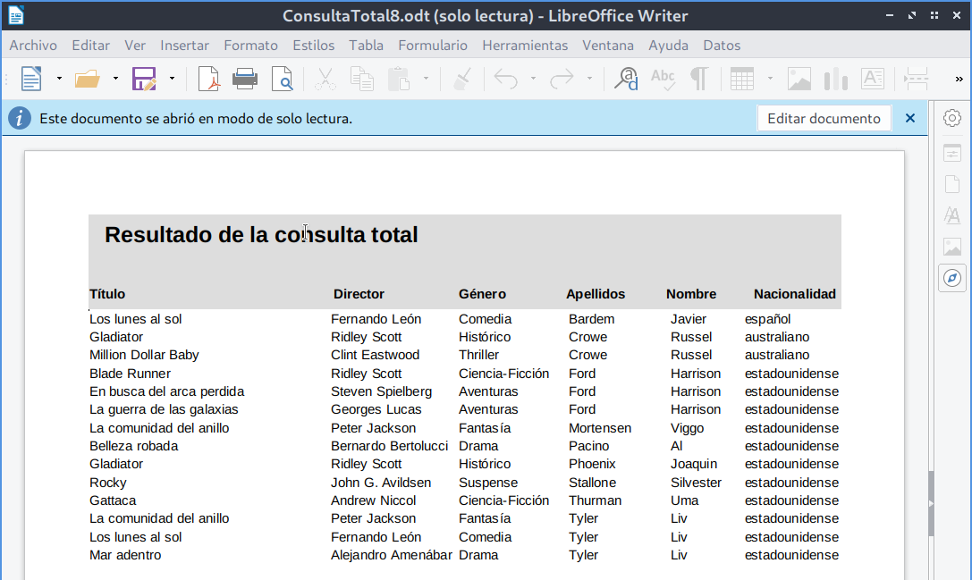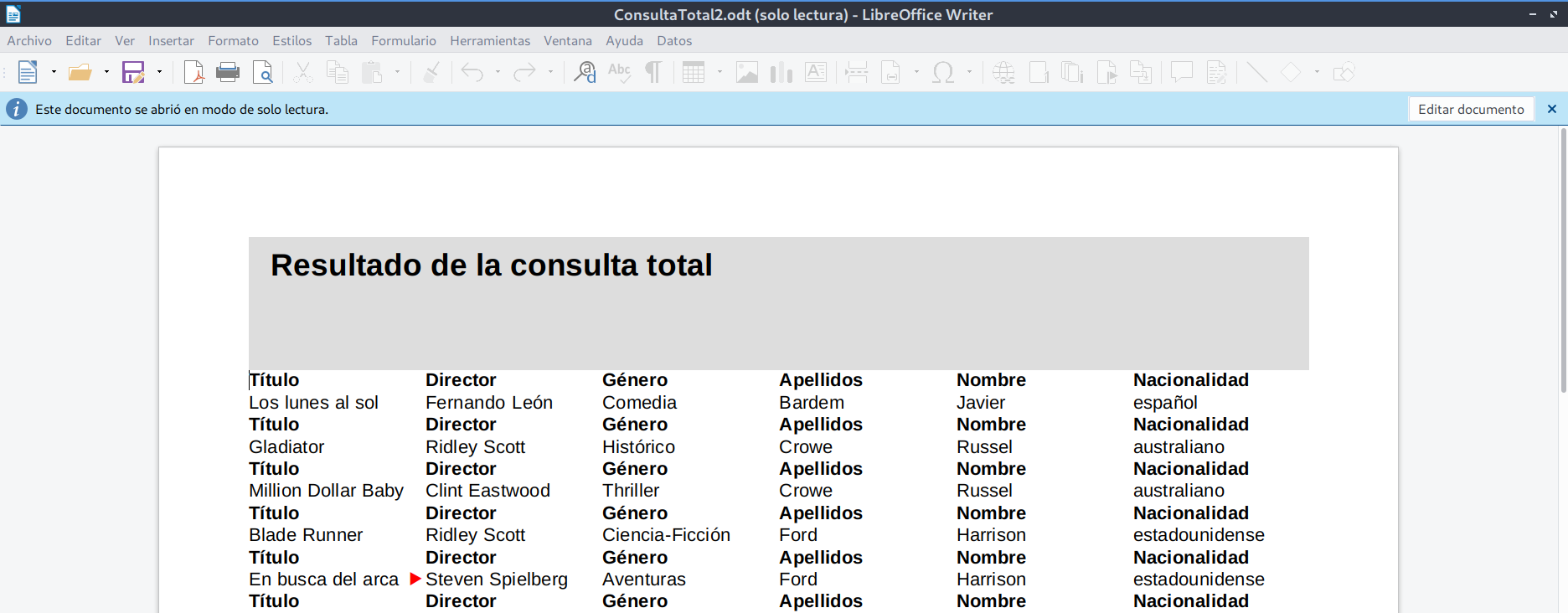 ConsultaTotal, los siguientes campos:TituloDirectorNombreGeneroApellidosNombreNacionalidad