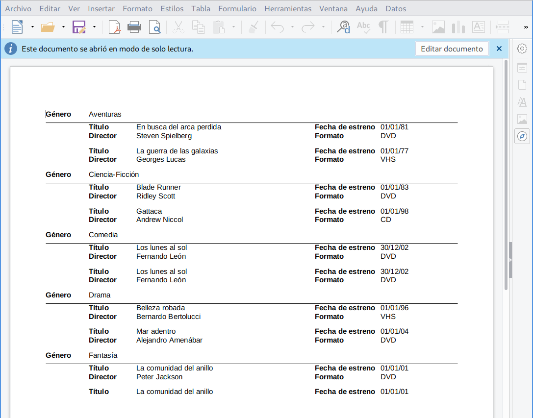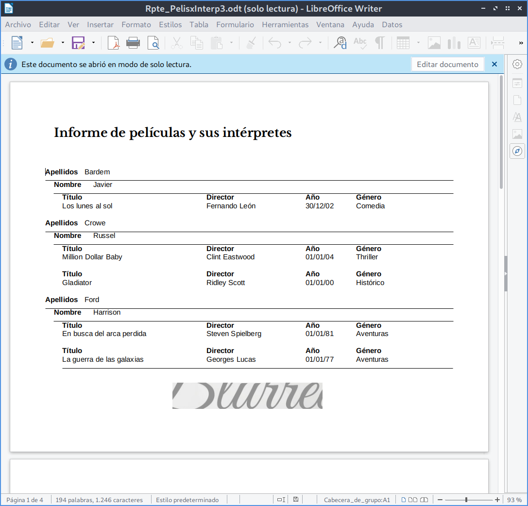 Vista previa (documento de Writer) del informe -