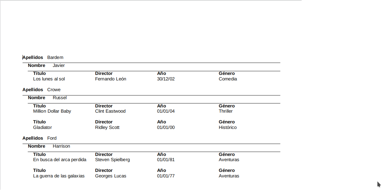 En el último informe agruparemos los datos por intérprete, mostrando las películas que ha protagonizado cada uno.